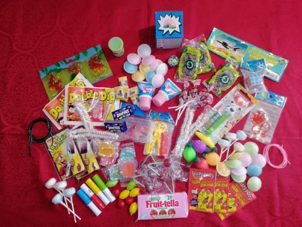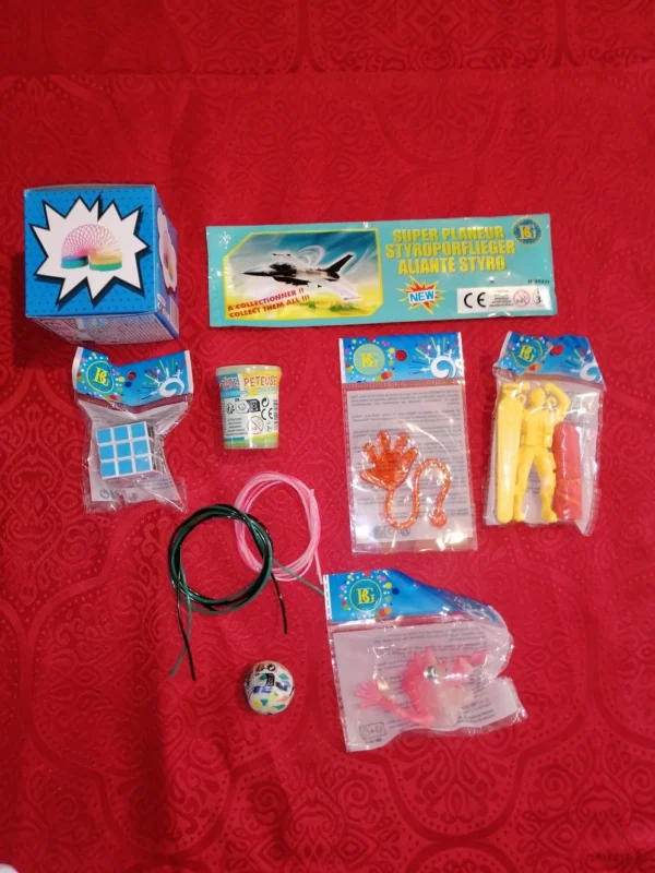 Assortiment de 9 jouets et 87 bonbons.